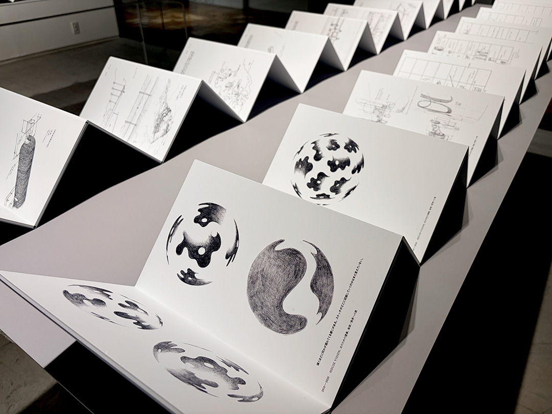 一冊の書籍を再構成した蛇腹折のパネル展示や、